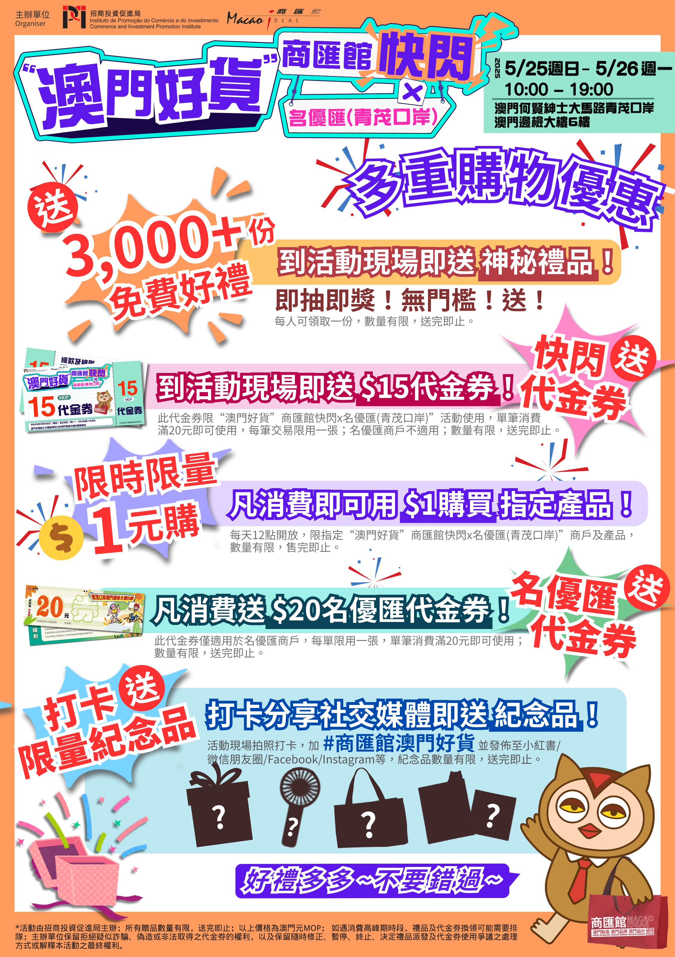 No local do evento, mais de 3.000 prémios serão distribuídos gratuitamente, sendo também disponibilizados vários descontos em quantidade limitada, nomeadamente compras no valor de só 1 pataca por um período de tempo limitado, cupões de desconto “flash mob”, produtos a preço especial, cupões de desconto dos comerciantes participantes e lembranças, entre outros. Assim sendo, convidamos cordialmente o público em geral a deslocar-se, nos dias 25 e 26 de Maio, das 10h00 às 19h00, ao Yobuy, sito no 6.º andar do Edifício do Posto Fronteiriço de Macau do Posto Fronteiriço Qingmao, na Avenida do Comendador Ho Yin, para fazer compras e experimentar o encanto dos “Produtos de Qualidade de Macau”.